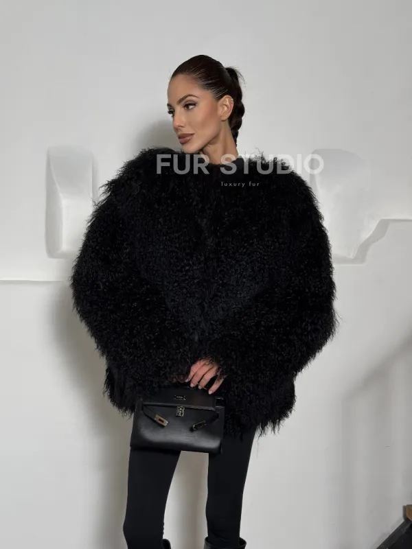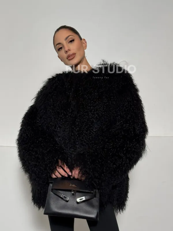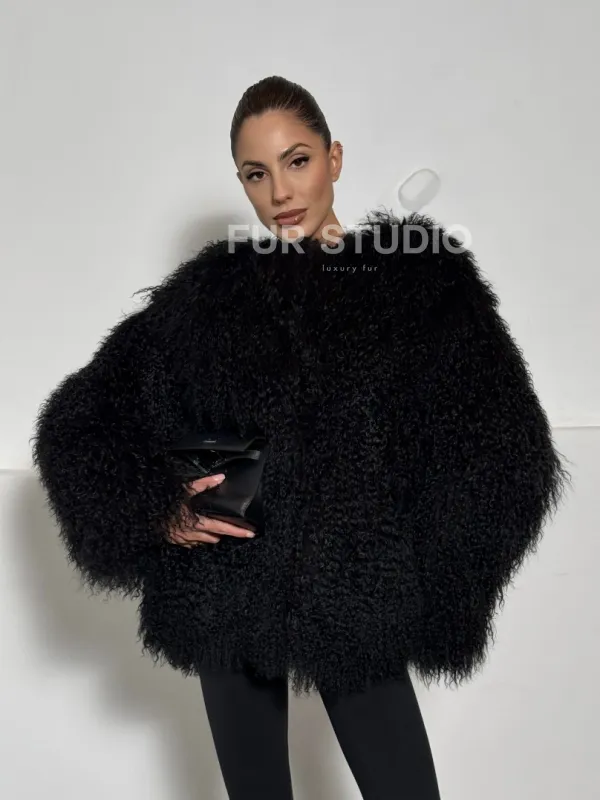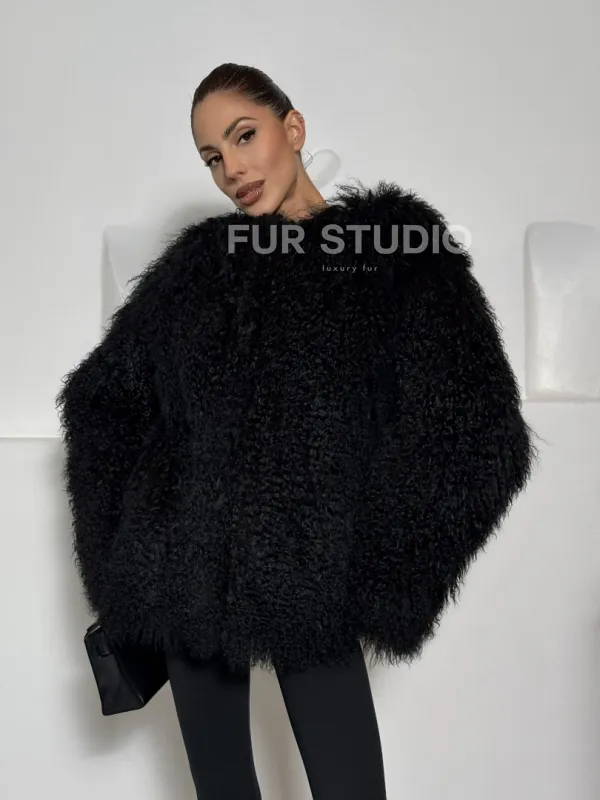 Черная шуба из меха ламы воротник шанель 101496
