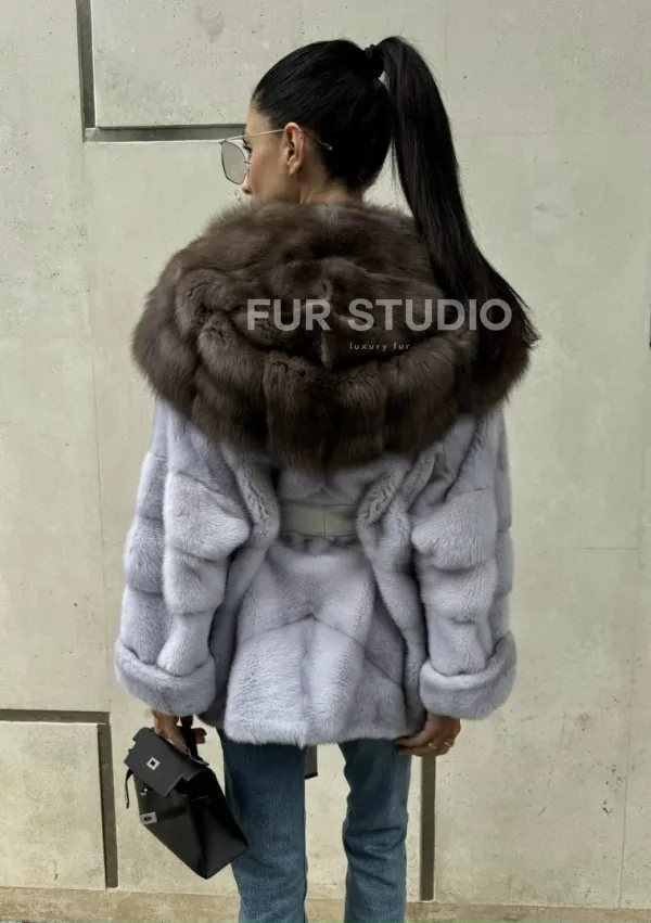 Шуба норковая с капюшоном из меха куницы - цвет голубой 100905