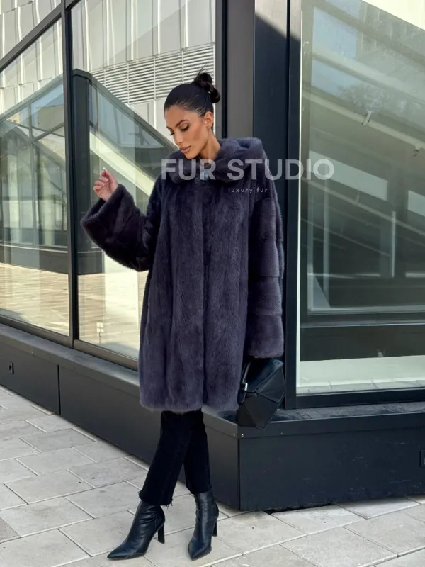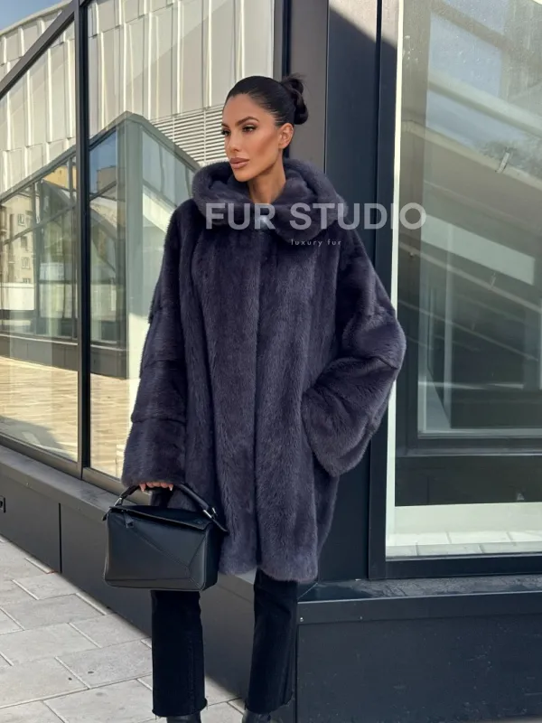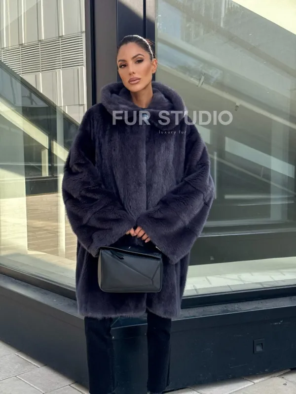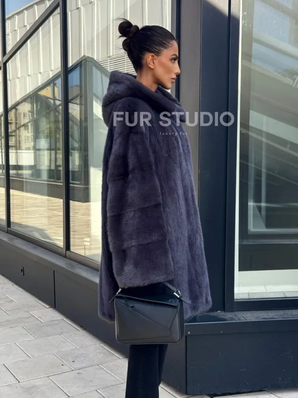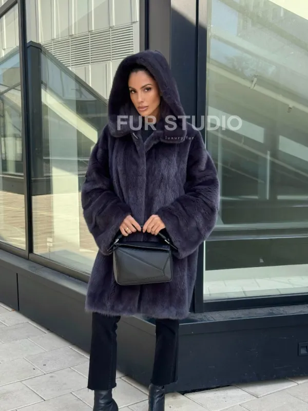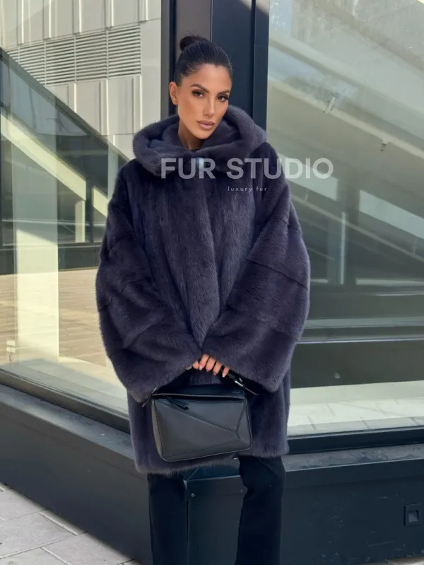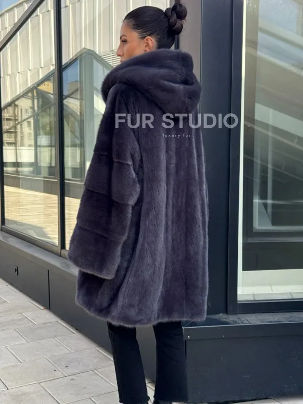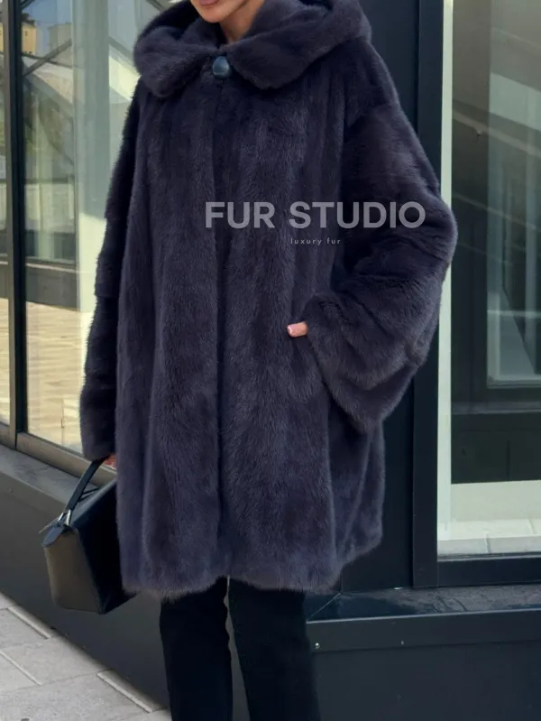 Норковая шуба с капюшоном, роспуск - темный графит 101052