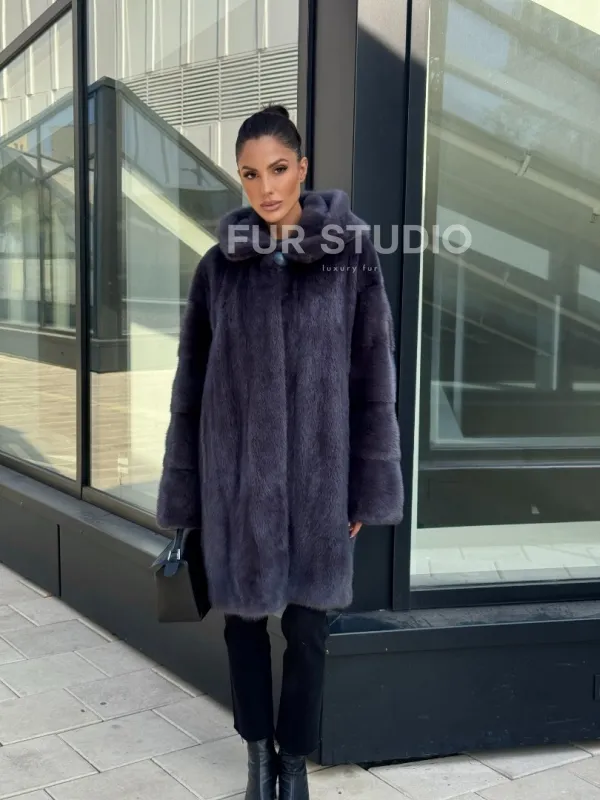 Мех данной шубы аукционная норка, цвет серый. Предлагается в размерах от 48 до 62. Длина модели 90-95 см, что выгодно подчеркивает фигуру девушек. Эта модель идеально подойдет для девушек и женщин, предпочитающих роскошные натуральные меха.