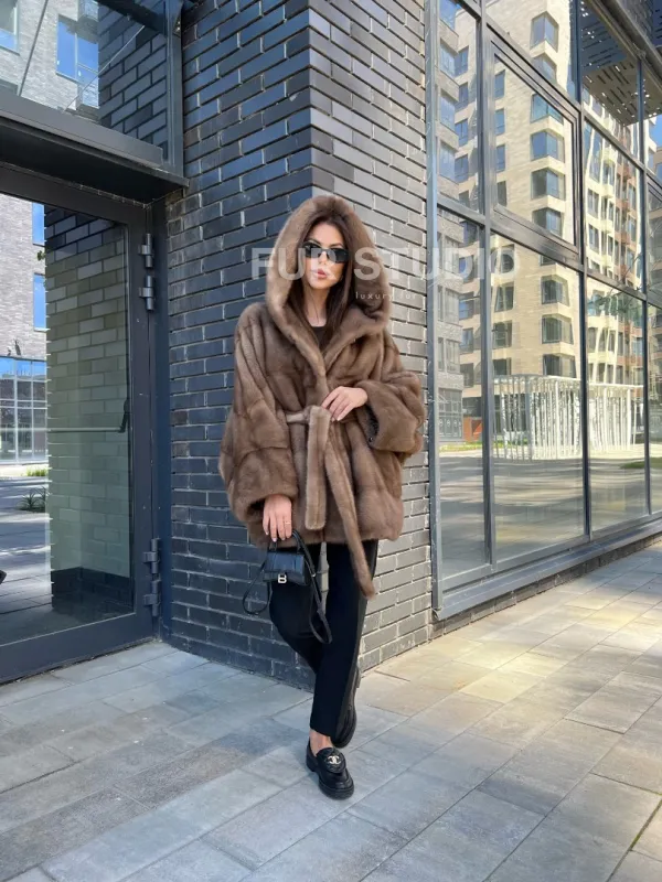 Норковое пончо с капюшоном в цвете пастель 100129