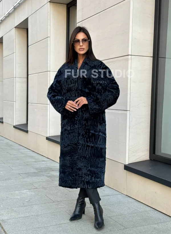 Пальто из меха каракуля с V-образным воротником, цвет Indigo Blue 101118