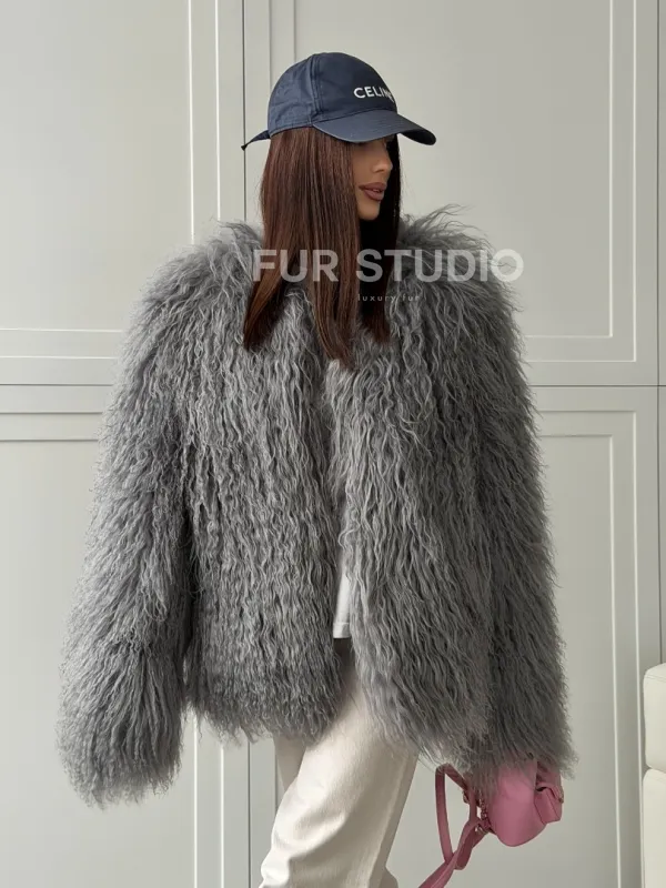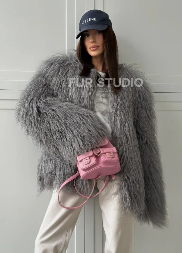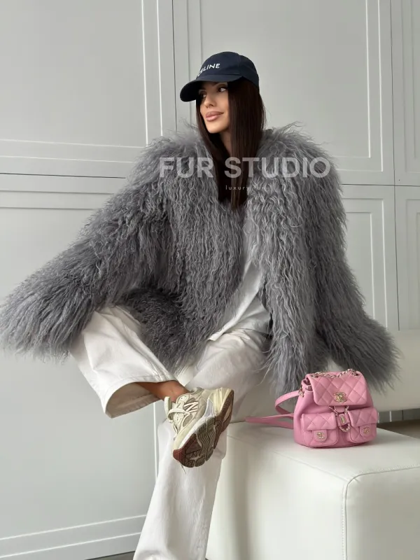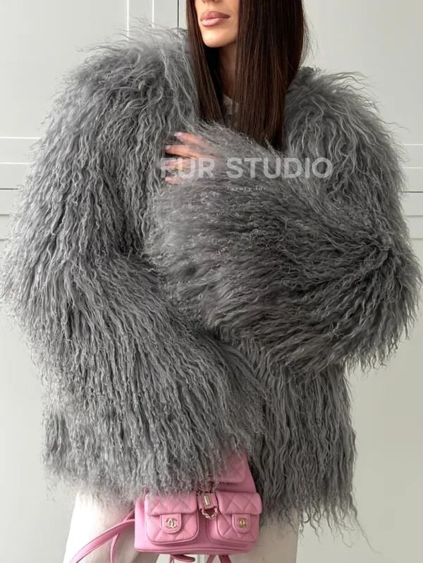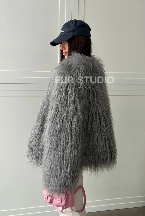 Серая шуба из натурального меха ламы 102811