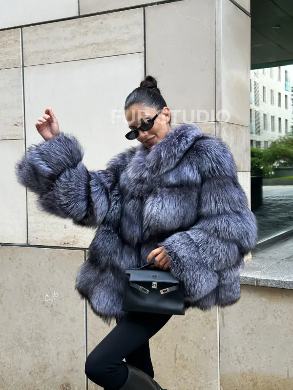 Мех данной шубы лиса, цвет серый. Предлагается в размерах от 42 до 50. Длина модели 60-65 см, что выгодно подчеркивает фигуру девушек. Эта модель идеально подойдет для девушек и женщин, предпочитающих роскошные натуральные меха.