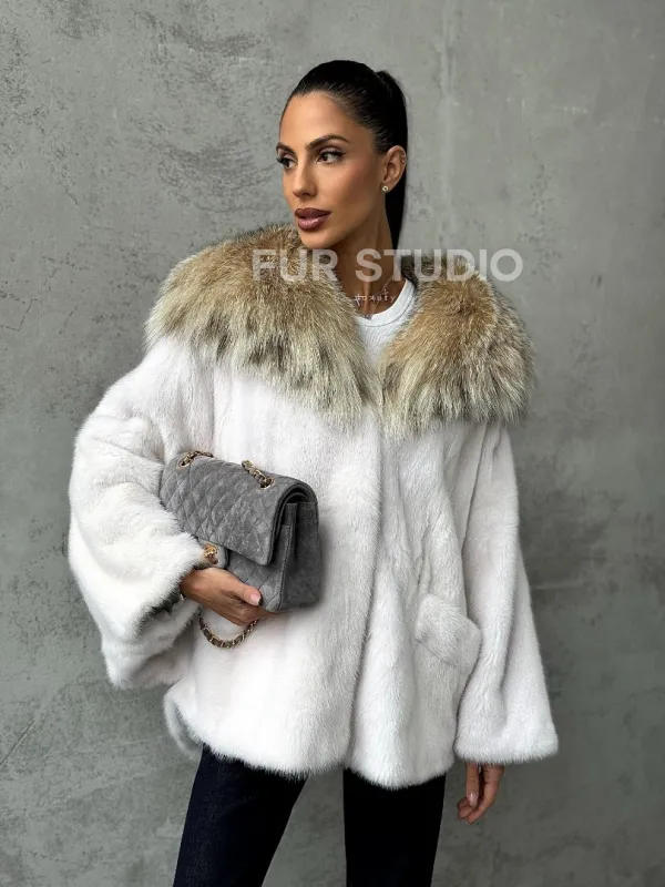 Мех данной шубы аукционная норка, цвет белый. Предлагается в размерах от 42 до 54 (oversize). Длина модели 70-75 см, что выгодно подчеркивает фигуру девушек. Эта модель идеально подойдет для девушек и женщин, предпочитающих роскошные натуральные меха.