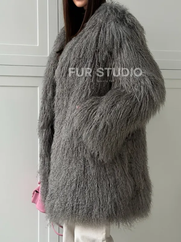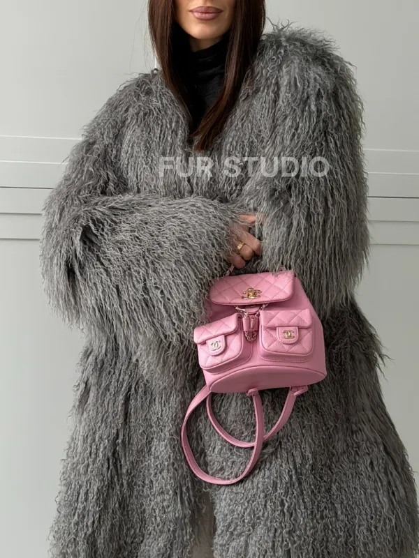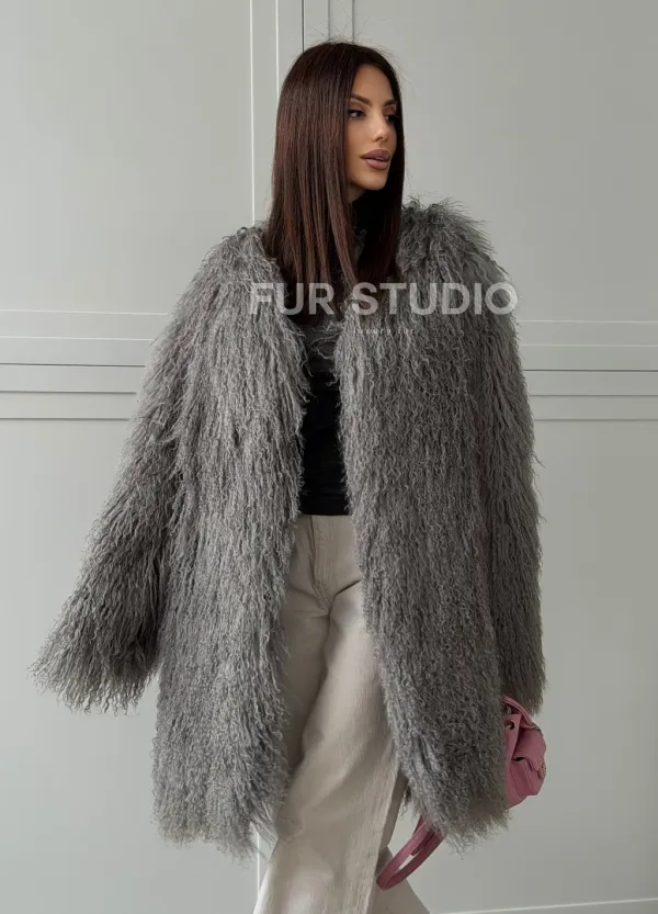 Удлиненная серая шуба из ламы 102810