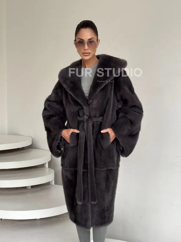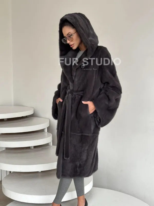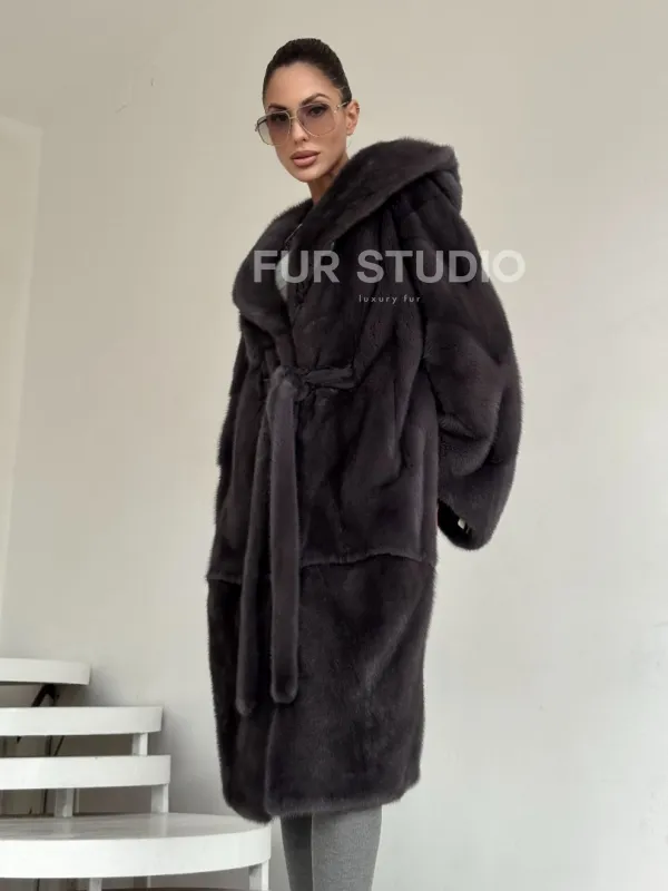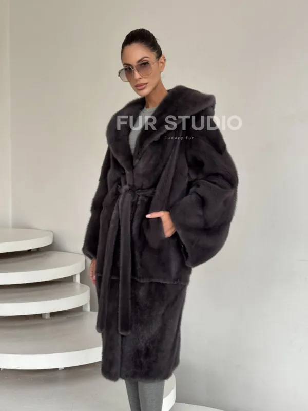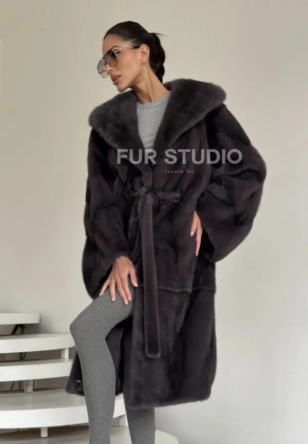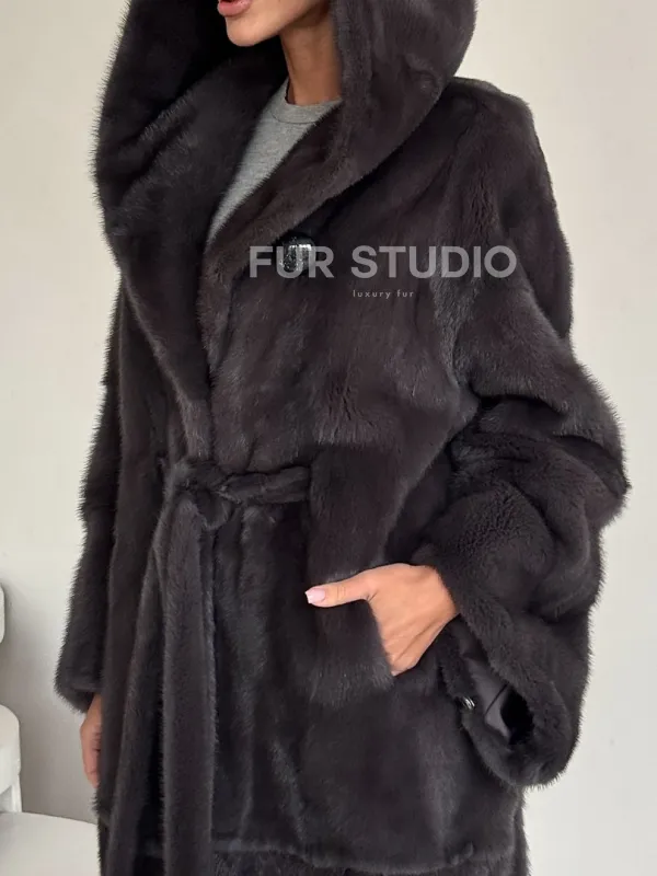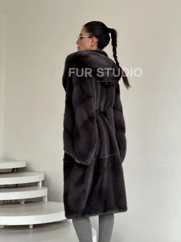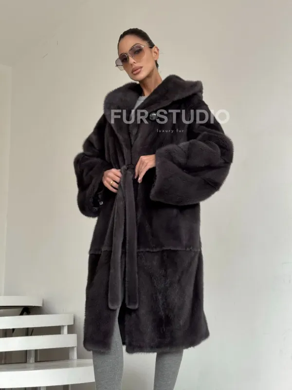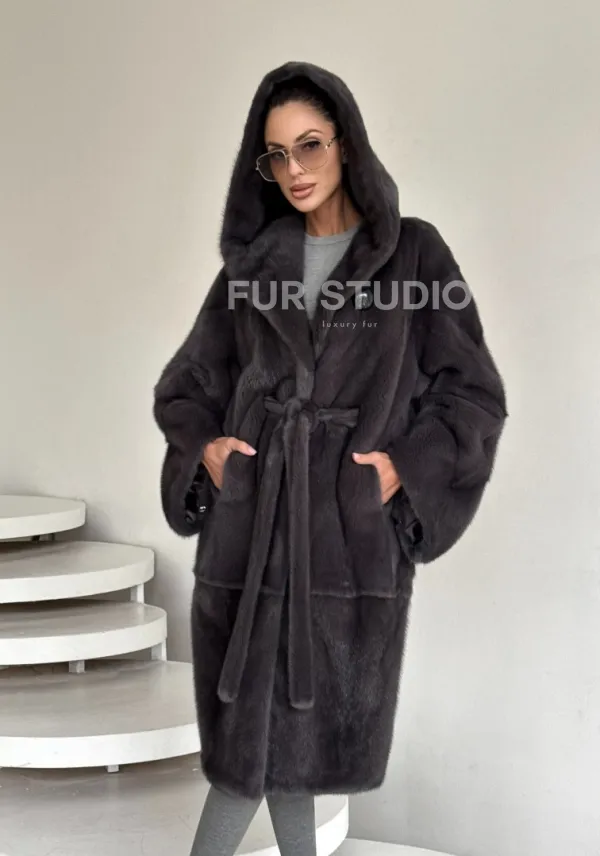 Зимняя норковая шуба с капюшоном - цвет графит 101396